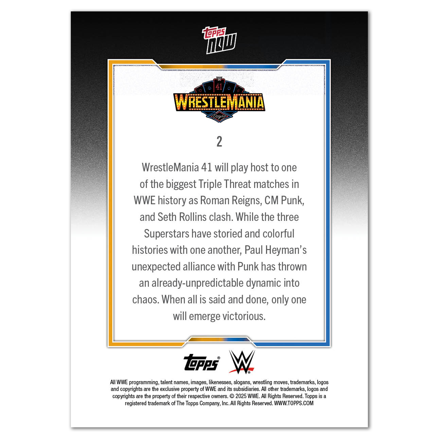 Topps NOW celebrates the greatest moments... as they happen! Only available at Topps.com. Print runs for every card are released in the WWE Topps NOW Archive.
